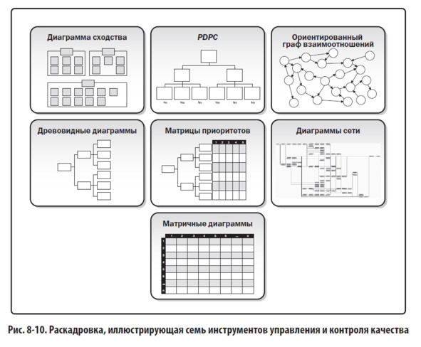 – Матричные диаграммы. Инструмент управления и контроля качества, используемый для анализа данных в пределах организационной структуры, созданной в матрице. При помощи матричной диаграммы стремятся показать силу зависимостей между факторами, причинами и целями, отображенными в матрице в виде рядов и столбцов.
