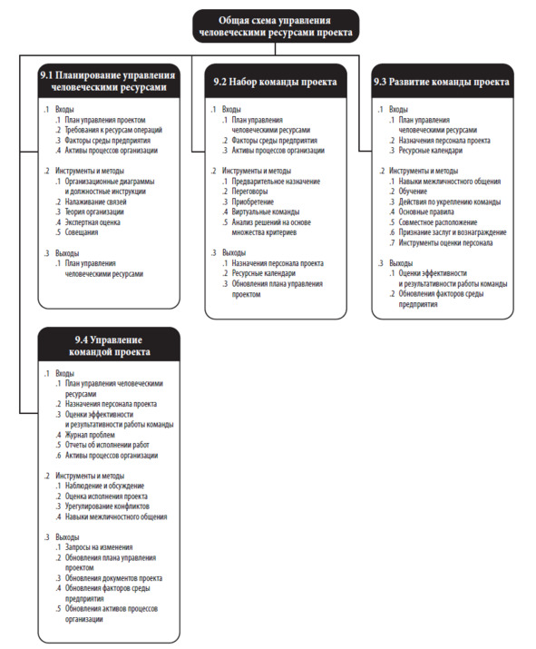 Управление человеческими ресурсами проекта включает в себя процессы организации, управления и руководства командой проекта. Команда проекта состоит из людей, которым определены роли и сферы ответственности за выполнение проекта. Члены команды проекта могут иметь различные наборы навыков, могут иметь полную или частичную занятость и могут быть добавлены или удалены из команды по мере выполнения проекта. Членов команды проекта также можно назвать персоналом проекта. Несмотря на то, что членам команды проекта назначены конкретные роли и сферы ответственности, участие всех членов команды в планировании проекта и принятии решений является ценным для проекта. Привлечение членов команды позволяет использовать имеющийся у них опыт при планировании проекта и укрепляет нацеленность команды на достижение результатов проекта.
