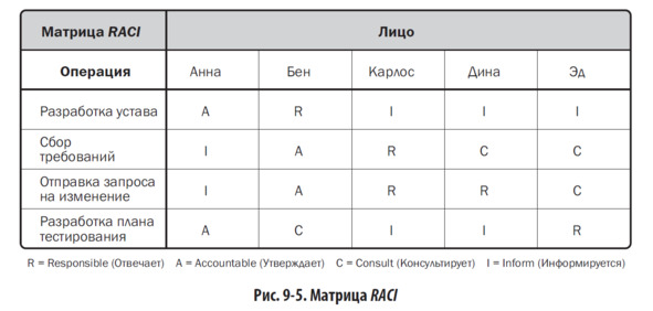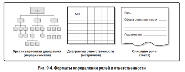 Существуют различные форматы документирования распределения ролей и сфер ответственности членов команды. Большинство форматов относятся к одному из трех типов: иерархический, матричный и текстовый. Кроме того, некоторые назначения по проекту указываются во вспомогательных планах, например в планах управления рисками, качеством или коммуникациями. Независимо от того, какой метод используется, цель всегда одна – добиться того, чтобы для каждого пакета работ был назначен однозначный ответственный за его исполнение и чтобы каждый член команды четко понимал свою роль и сферу ответственности. Например, для представления ролей высокого уровня можно использовать иерархический формат, текстовый формат лучше подходит для подробного документирования сфер ответственности.
