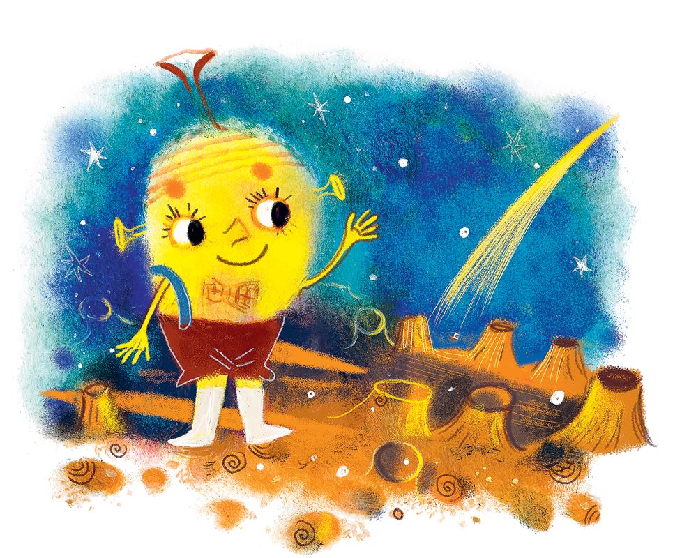 У Звёздочки даже дух захватило от стремительного полёта. Ведь она летела первый раз в жизни. Конечно, если бы всё это происходило на Земле, то ветер бил бы ей в лицо и свистел в ушах. Но, как известно, в космосе нет воздуха, поэтому о скорости полёта Звёздочки можно было судить лишь по окружавшим её звёздам, которые просто слились в сплошные яркие полосы. Наконец впереди показалась какая-то планета. На самом деле это была Луна, но Звёздочка не знала об этом. Звёздочка уже почти пролетела мимо неё, когда вдруг услышала доносившиеся с неё странные звуки. Кроме того, что она была очень упрямой, Звёздочка была ещё и очень любопытной. Поэтому она, конечно же, не могла пролететь мимо…