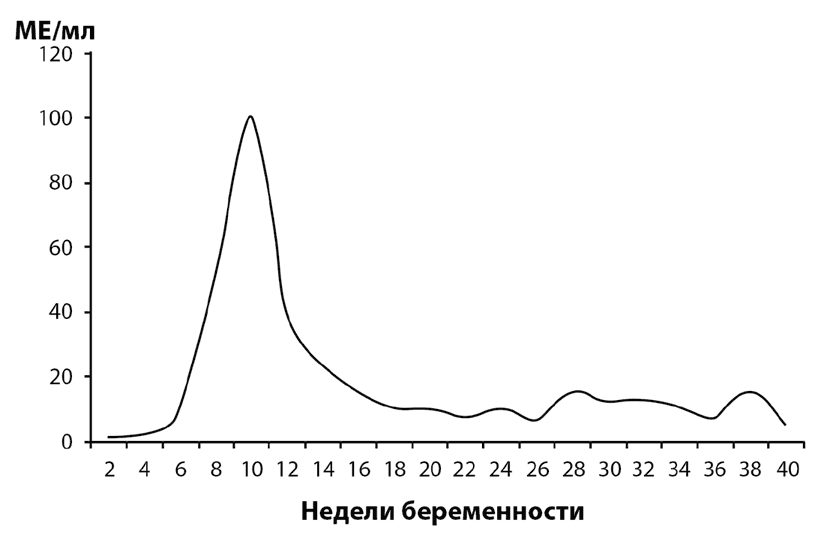 Уровень ХГЧ повышается до 10–12-й недели, после чего его рост замедляется, а потом наблюдается новый подъем после 22 недель (рис. 2).