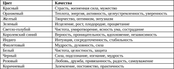 Посмотрите на несколько колод Таро и обратите внимание на то, как художники, которые их создавали, использовали цвета для выражения определенных качеств. Ниже в таблице перечислены качества, которые ассоциируются с различными оттенками.