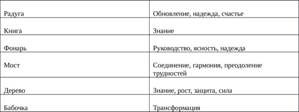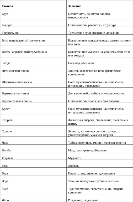 Художники Таро намеренно выбирают символы из различных духовных, культурных, магических и психологических традиций, чтобы передать информацию непосредственно Вашему подсознанию. Подобно мифам, символы преодолевают границы религии, национальности и времени, представляя универсальные темы и концепции, с которыми могут соотнестись люди повсюду. В следующей таблице представлены несколько общих, универсально понятных символов, которые часто встречаются на картах Таро, вместе с их обычными значениями.