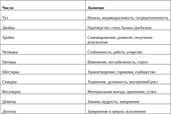 Нумерованные карты Таро, также называемые числовыми картами, имеют индивидуальные значения, основанные на резонансе числа. Числа также показывают стадии развития и, таким образом, связывают каждую числовую карту с другими картами, которые появляются в раскладе. Позже, когда мы углубимся в Младшие Арканы, мы также рассмотрим отношения между числами и мастями. Карты Старших Арканов также имеют номера, о которых мы поговорим позже. Сейчас давайте вкратце рассмотрим, что могут рассказать нам числа на картах.