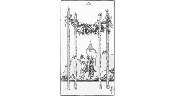 В колоде Райдера-Уэйта Четверка Жезлов изображает счастливую пару, празднующую что-то, поднимающую букеты цветов в воздух. Вдали виднеется их замок; на переднем плане – своего рода ворота, украшенные фруктами и цветами, приглашающие нас войти и принять участие в праздновании. Это карта урожая, которую ведьмы могут ассоциировать с саббатом Лита, когда мы радуемся изобилию земли.
