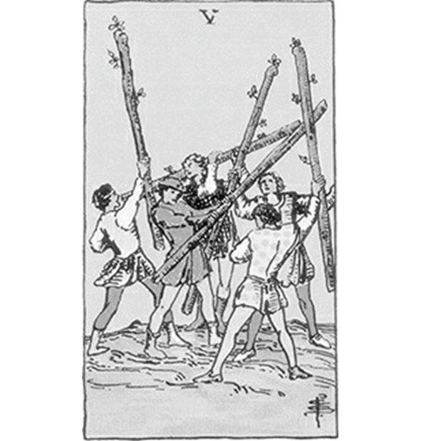 Когда появляется Пятерка Жезлов, это указывает на борьбу за власть, деньги или признание. Борьба эго может мешать плавному течению жизни. В некоторых случаях карта показывает конкуренцию за ресурсы или контроль. Присутствуют путаница и разногласия.
