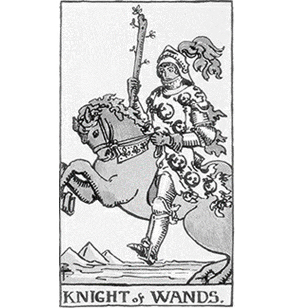 В Таро рыцари традиционно изображаются на коне, в доспехах, как рыцари прошлых времен. В некоторых колодах их называют принцами, всадниками или валетами. Рыцари – это вестники и путешественники. Рыцарь Жезлов – энергичный молодой человек, иногда изображаемый на вставшем на дыбы коне, готовый отправиться в дальние дали – или, возможно, на рыцарский турнир. В раскладе Рыцарь может обозначать реального человека. Если это так, он – жизнерадостный, любящий веселье авантюрист, смельчак, возможно, спортсмен.