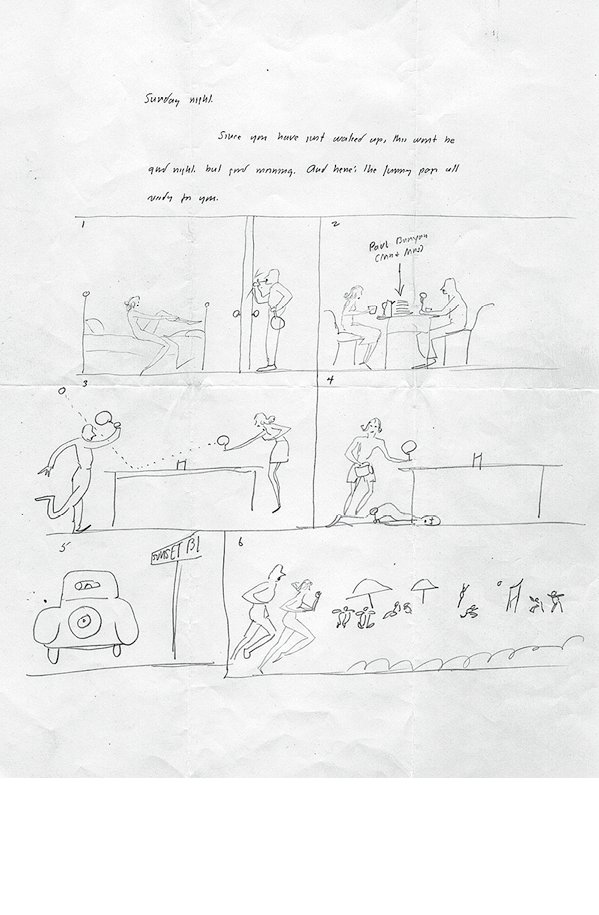 Комикс озаглавлен парой строк: Sunday night. Since you have just waked up, this won’t be good night, but good morning. And here’s the morning paper all ready for you[5]. О взаимоотношениях Меты и Фолкнера мне известно лишь из писем, но, судя по тексту, он писал это письмо, пока Мета спала, в той же спальне или, возможно, в соседней комнате, словом, где-то поблизости, а он принялся рисовать, как только она закрыла глаза, и один в наступившей тишине создал первое, что поразит воображение Меты, как только она проснется. Since you have just waked up this won’t be good night, but good morning. Ему хотелось подтолкнуть ее к первой мысли, первому воспоминанию, которое озарит ее разум по пробуждении, опередив первое мочеиспускание, желание глотнуть воды, чтобы прочистить горло, кофе, который взбодрит. And here’s the morning paper… Неясно, является ли это хроникой событий, происходивших накануне, поскольку газеты – субъективное отражение событий, происшедших за последние 24 часа на определенной территории (город, страна, мир), или, наоборот, эмоциональным прогнозом того, что может произойти на следующий день, то есть чего хотел бы Билл, когда Мета проснется. По некоторым признакам я догадываюсь, что все это пережито, передо мной хроника тихого воскресенья, и поскольку письмо озаглавлено Sunday night, вряд ли оно представляет собой фантазии автора о следующем буднем дне, к тому же понедельнике. Это графическая хроника идеального дня, я смотрю на нее, и на ум приходит песня Лу Рида Oh, it’s such a perfect day, I’m glad I spent it with you[6]… Это такой же обычный, спокойный день, наполненный немудреными и доступными удовольствиями, подобными тем, которые описывает Лу Рид в своей песне о том, что единственное занятие в этот perfect day