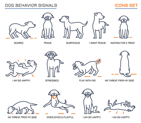 В мире собак щенки с самого начала обмениваются информацией друг с другом посредством языка тела. Это включает в себя выражение лица, положение тела, запах щенков друг друга и звуки, которые они издают. Как правило, для выражения своих чувств собаки используют рот, глаза и уши, а также хвост.