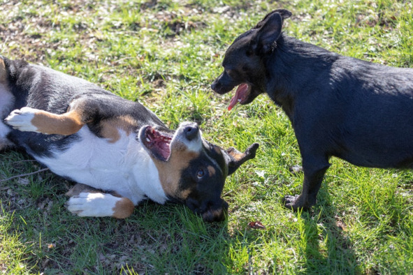 Иллюстрация 4: Аппенцеллерская горная собака играет с дворняжкой лабрадором на улице
