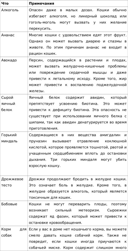 Поэтому есть несколько причин использовать мясо не сырым и не размороженным, а исключительно приготовленным. Конечно, это значительно изменяет консистенцию белка, и, кроме того, витамины и таурин разрушаются под воздействием тепла. Некоторые даже считают, что вареное мясо непригодно для кошек, поскольку помимо таурина и других жизненно важных аминокислот при варке в значительной степени теряются витамины и ферменты. Однако, поскольку покупной корм для кошек всегда подогревался, а многие кошки, питавшиеся исключительно им, доживают до глубокой старости, этот факт, по-видимому, не вредит кошкам.