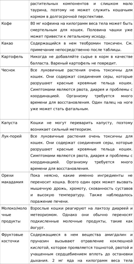 Кошки не могут синтезировать витамин А в организме. Поэтому для них бесполезно, если растения содержат предшественник каротина. Им также необходим таурин. Жизненно важные вещества (таурин и витамин А) присутствуют только в продуктах животного происхождения. Поэтому кошка должна потреблять как минимум молоко и яичные продукты. Здесь следует отметить, что кошки не переносят обычное коровье молоко.