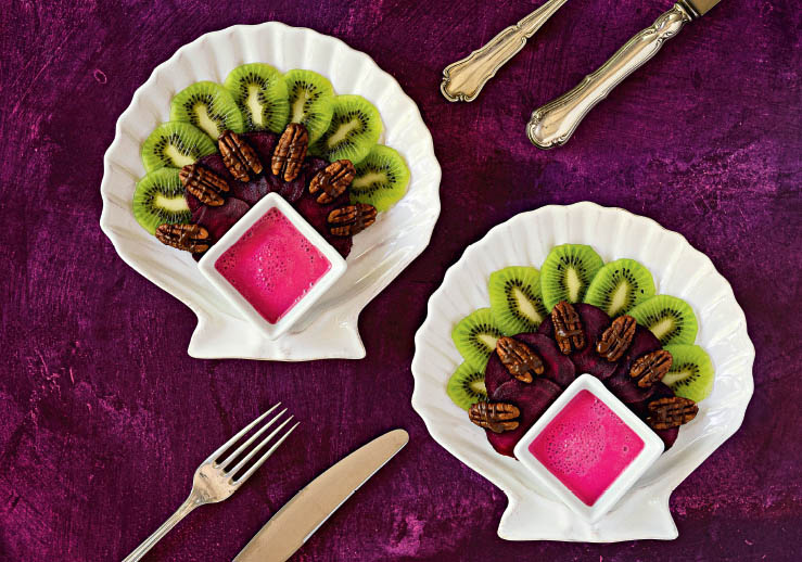 Schokolade im Wasserbad schmelzen. Pekannüsse auf Teller oder Kuchengitter legen und mit heißer Schokolade beträufeln. Rote-Bete-Saft, Kokosmilch, Vanille und Ahornsirup mit einem kleinen Schneebesen in einer Schüssel geschmeidig rühren. Kiwis schälen, hauchdünn schneiden und in Fächerform jeweils auf 4 Teller legen. Rote Bete genauso schneiden und unterhalb des Kiwifächers platzieren.