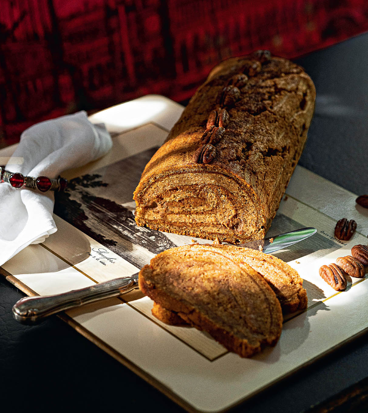 Alle Zutaten für die Pekannusscreme in der Küchenmaschine 2 Minuten geschmeidig mixen. Die Backbleche aus dem Ofen nehmen, den Ofen anlassen. Die Hälfte der Creme gleichmäßig auf einem Teig verteilen. Den anderen Teig samt Backpapier vom Blech auf ein großes Holzbrett ziehen, 10 Minuten abkühlen lassen. Mit beiden Händen unter das Backpapier gleiten, heben und genau auf die mit Nusscreme bestrichene Teigfläche stülpen. Papier abziehen. Restliche Creme auf der oberen Teigschicht verteilen. Backpapier links und rechts an kürzerer Seite anheben. Mithilfe des Papiers Teig vorsichtig einrollen. Keine Sorge, wenn er etwas reißt. Rolle an den langen Seiten sanft zusammendrücken, auf mit Backpapier bedecktes Blech heben. 2 EL Ahornsirup darübergießen, Nüsse auf den Rollenrücken legen. Mit Zimt bestreuen und noch einmal 2 EL Ahornsirup darüberträufeln. Ca. 40 Minuten im Ofen goldbraun fertig backen. Abkühlen lassen. Rollenenden mit dem Brotmesser abschneiden.