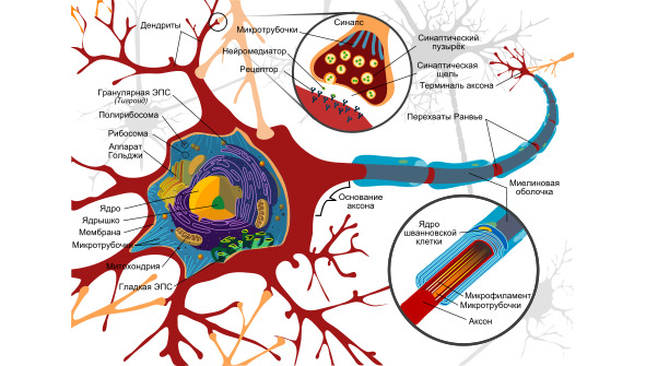 Мозг состоит из нейронов – нервных клеток, генерирующих и принимающих электрические импульсы. Не будем вдаваться в подробности данного процесса, но крайне важно понимать, что нейрон – это живая клетка, со своей химией, ритмикой процессов, необходимостью обеспечения питанием и защитой и т. д. То есть это – химическая лаборатория, выдающая определенные вещества и электрические разряды в ответ на воздействие. Как и любая клетка в организме, при попадании одних веществ она выдает одни сигналы, при попадании других – другие, а некоторые воздействия могут даже менять ее ядерную ДНК, то есть устройство, что, неизбежно, приведет к изменению исходящих сигналов. Важно и то, что входящих сигналов от других нейронов могут быть сотни тысяч (они идут по отросткам – дендритам), а исходящий всего один, передающийся через «провод» -аксон (который иногда может немного ветвиться). Максимальная длина отростка в мозге человека 15 см, в теле около 30, а в спинном мозге может достигать 1 метра!
