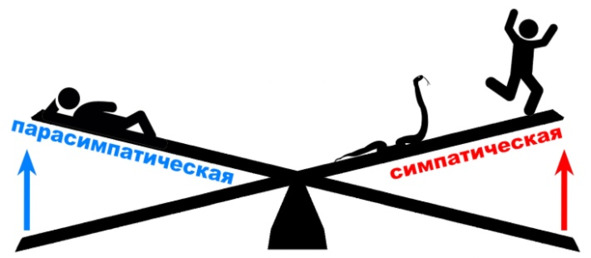Из школьного курса биологии напомню, что вегетативная нервная система состоит из двух систем, активность которых направлена в противоположные стороны: симпатической и парасимпатической. Даже на физическом уровне нервные центры этих систем в теле сильно разнесены, чтобы избежать путаницы. Дело в том, что организму нужно либо выживать, проходя через опасную ситуацию, и тратя ресурс, либо эти ресурсы накапливать, пребывая в состоянии покоя, то есть «зоны комфорта». Как на автомобиле: либо вы едете, либо заправляетесь. И тратить силы обычно получается гораздо быстрее, чем накапливать. Отсюда и две системы: стрессовая – симпатическая, и антистрессовая – парасимпатическая. Произвольно управлять этими системами ни одно животное не может, они самостоятельно включаются и отключаются, в зависимости от обстоятельств. Парасимпатическая система расположена, главным образом, в головном мозге, она же управляет нашей речью. Именно поэтому, при активизации симпатической нервной системы – антагониста парасимпатической, у нас появляется ком в горле, пропадает дар речи, спирает дыхание, а рациональное мышление отключается и т. д.