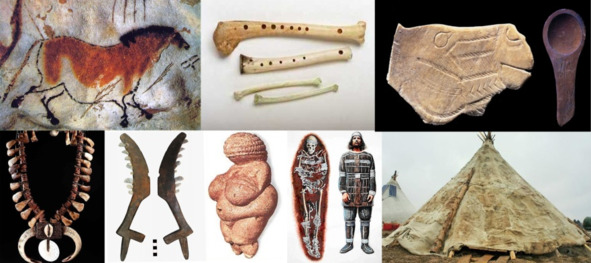 Самый древний фигуративный рисунок сапиенсов имеет возраст 44 тыс. лет. Он сделан на Сулавеси, в Индонезии, имеет сюжет, множество фигур животных и людей в масках. По всем параметрам он опережает подобные мировые изображения минимум на 20 тысяч лет! В других же местах самые древние датировки палеолитического искусства в пещере Нерха, Испания, относятся ко времени 43,5—42,3 тыс. лет назад. Самый древний отпечаток руки на стене пещеры в Эль Кастилло имеет минимальный возраст 40,8 тысяч лет назад, а позже к нему были пририсованы красный диск и другие отпечатки рук 37,3 и 24,2 тыс. лет назад, соответственно. Древнейший известный нам рисунок фигуры дикого быка на острове Борнео был создан около 40 тыс. лет назад. Тем же временем датируется фигурка человека с головой льва из пещеры Штадель в Германии. Ранние наскальные изображения в Узбекистане имеют возраст 38 тыс. лет. В Тито Бастилло антропоморфная фигура на сталактите была нарисована 37,7—35,5 тыс. лет назад. Возраст наскального искусства во французской пещере Шове – 35,3—38,8 тысяч лет, а росписей Альтамиры – едва ли не самого известного «Эрмитажа» палеолита – составляет 35,6 тыс. лет и приходится на времена культуры ориньяка. Примерно в то же время неизвестный гений вырезал из бивня мамонта голову и изогнутую шею палеолитического жеребца, вложив туда бурю эмоций, которые вызывало у него это животное. Мастерство и абстрактность мышления продолжали расти, и 25 тыс. лет назад в Пэйр-нон-пэйр, Франция, какой-то умелец очень качественно вырезал из бивня мамонта подвеску в виде морской ракушки каури. Это ж надо было додуматься! Таким образом, только сапиенсы развили весь комплекс искусства и распространили его впоследствии среди множества групп: украшения, живопись на скалах, фигурки, шаманские обряды, песни, мифы…