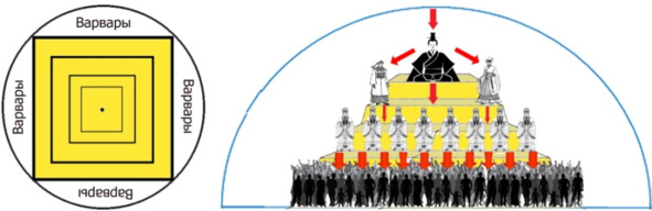 Если смотреть на эту конструкцию сбоку, то получается нечто вроде ступенчатой пирамиды, как у майя. Под всеобъемлющим Небом на вершине Император, ниже министры, потом чиновники, а внизу обычный народ. Такой структурой определяется Воля Неба и ход мировых процессов. Что отражено даже в средневековой китайской карте, где Поднебесная в центре, а по краям ютятся варварские народы и государства.