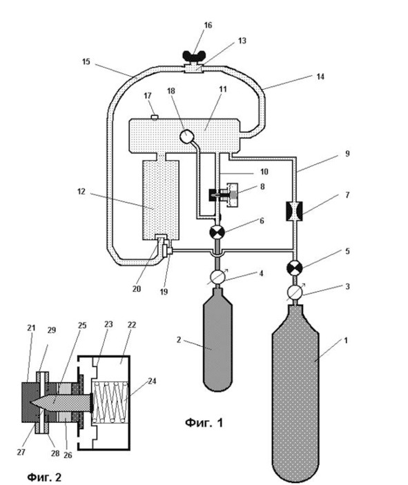 На глубинах до 10 м давление воды на диафрагму 23 не достаточно, чтобы преодолеть усилие пружины 24 и игла 25 запирает дюзу 27. При погружении водолаза на глубину свыше 10 м, наружное давление преодолевает сопротивление пружины 24, диафрагма 23 прогибается в сторону камеры постоянного давления 22, игла 25 приоткрывает дюзу 27 и азот из баллона 2, через вентиль 4 и редуктор 6, входной штуцер 28, дюзу 27 поступает в выходной штуцер 29 и далее в дыхательный мешок 11.