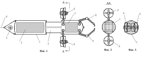 Цифрами обозначены: 1 – прочный корпус НПА; 2 — аккумуляторная батарея; 3 – катушка ВОЛС; 4 – нитка ВОЛС; 5 – ниша для винторулевых колонок; 6 – винто-рулевые колонки; 7 – блок автоматики и электроники; 8 – левый манипулятор; 9 – правый манипулятор.