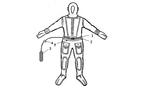 Однако гидрокомбинезон отличается от обычного тем, что ниже поясного ремня 1 имеется поясное резиновое кольцо 2, в которое из баллона 3 может подаваться воздух через вентиль 4. Помочившись в гидрокомбинезон, водолаз открывает вентиль 4 и надувает кольцо 2. Оно расширяется и плотно прижимается к гидрокостюму.