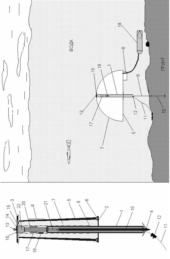 Перед постановкой, выключателем 16 включают гидроакустический маяк 22 в дежурный режим приёма запросного сигнала, реле давления 14 устанавливают на 6 – 8 м выше глубины места в районе постановки базы.