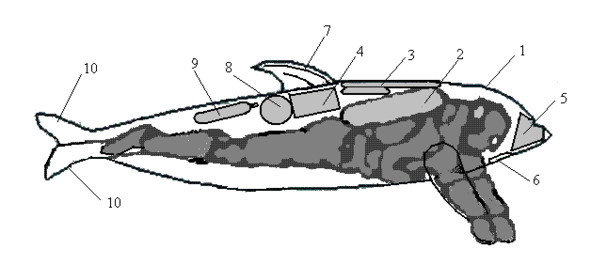 Цифрами обозначены: 1 – ткань гидрокостюма; 2 – электрохимический генератор (топливные батареи); 3 – дыхательный аппарат на селективных мембранах; 4 – система гидравлики; 5 – РЭВ; 6 – иллюминатор; 7 – антенны УКВ – СВЧ радиосвязи; 8 – автоматика; 9 – баллоны с жидким водородом; 10 – моноласт или две ласты.