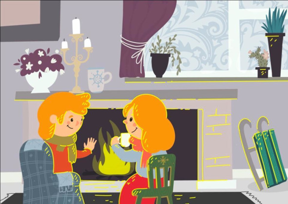 Давай поизучаем картинку глубже, рассмотрим детали. Какое настроение у детей? Какая температура в комнате? Что можно добавить, а что изменить в комнате? (Например, добавить каминный набор: кочергу, лопатку, щипцы.)