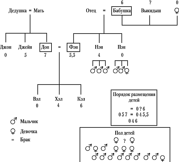 На рис. 5 показано такое семейное древо. В семье Эйбл трое мальчиков: Кэл, Хэл и Вэл. Когда родился Вэл, Хэлу было четыре года, а Кэлу шесть, так что их порядок 0–4–6. Их отец Дон был старшим из детей, размещенных в порядке 0–5–7. Их мать, Фэн, старшая из трех дочерей, размещенных в порядке 0–4–5. У двух сестер матери, Нэн и Пэн, тоже по трое детей. Мать Фэн была старшей из двух дочерей, порядок которых – 0–6, с выкидышем между ними. Легко заметить, что все эти тройки детей рождались на протяжении пяти-семи наиболее плодовитых лет.