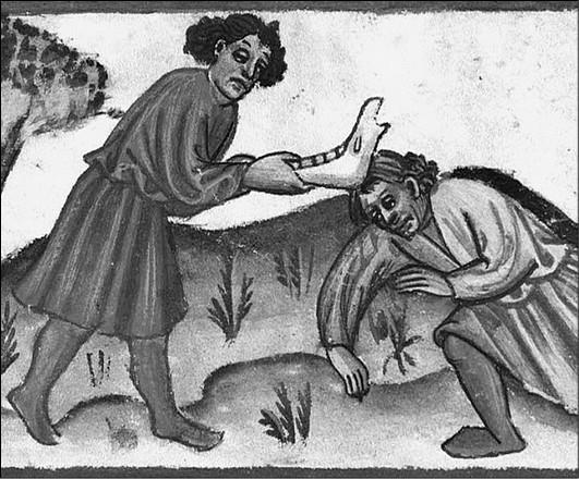 Каин убивает Авеля. Итальянская миниатюра. XV в.