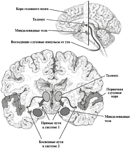 Парная структура таламуса располагается на вершине мозгового ствола; ее можно рассматривать как первичную ретрансляционную станции обработки информации от органов чувств. Важно то, что таламус напрямую связан с системой 1, прежде всего с прилежащими ядрами и миндалевидными телами, которые опосредуют соответственно удовольствие и отвращение59. Также таламус отправляет информацию о звуке в слуховую часть системы 2, которая охватывает элемент височной доли, известной как извилина Гешля, и корковых ассоциативных областей за ее пределами. Они интерпретируют звук и заставляют нас его осознавать; необходимо отметить, что эти связи с системой 2 скорее косвенные и потому более медленные, чем связи с системой 1.