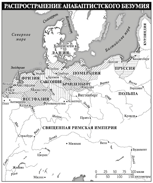 После катастрофической крестьянской войны, опустошившей Германию, центр общего безумия сместился на север, на территорию нынешних Западной Германии и Нидерландов. На протяжении десятилетий эта область наслаждалась процветанием благодаря Ганзейскому союзу, свободной конфедерации торговых государств, владения которой тянулись по берегам Балтийского и Северного морей приблизительно от сегодняшней Эстонии до Фландрии [53]. Крестьянская война вспыхнула в первую очередь из-за широкого социального недовольства, а вот новые беспорядки в Германии и Голландии оказались вызваны религиозным учением анабаптизма.