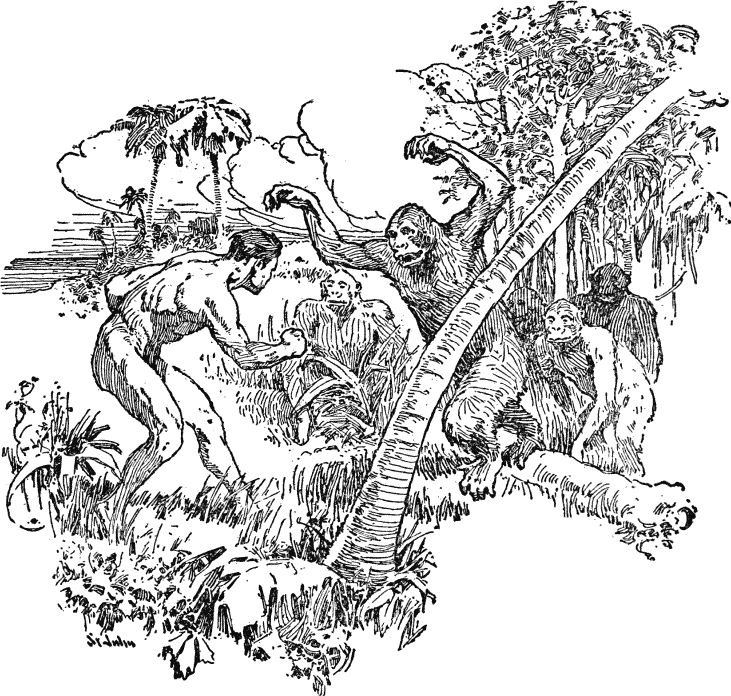 Выпятив грудь, он поставил ногу на тело поверженного врага и, откинув назад свою прекрасную голову, издал обезьяний победоносный крик. Джунгли эхом откликнулись на эту дикую песнь. Птицы притихли, а крупные животные и хищные звери поспешно и неслышно скрылись: немногие из них решались вступить в схватку с большими человекообразными обезьянами.