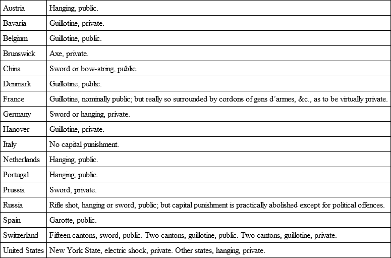It may be interesting to close this chapter with a list of the principal methods of execution in use in foreign countries.