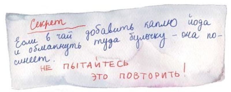 Достаёт булочку из чашки. Она ярко-синяя.