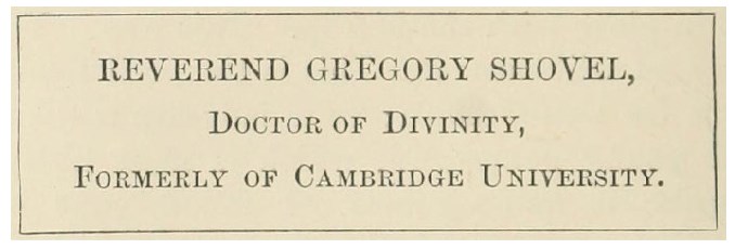“He is named” (I said this with a little pride, because I thought that perhaps, from my own rusticity and the homeliness of my companion, she might not have thought me so highly connected), “he is the Reverend Gregory Shovel, Doctor of Divinity.”