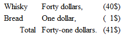 Mr. Gilead Beck once told me of a party gathered together in Virginia City to mourn the decease of a dear friend cut off prematurely. The gentleman intrusted with the conduct of the evening's entertainment had one-and-forty dollars put into his hands to be laid out to the best advantage. He expended it as follows: —