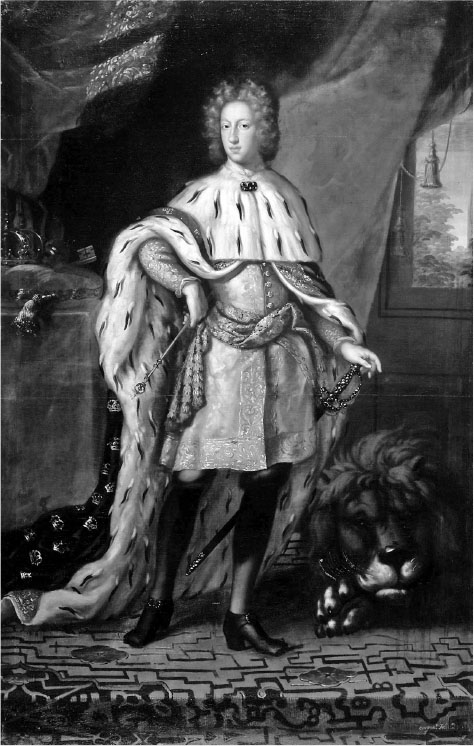 Король Швеции Карл XII в коронационном костюме в окружении символов королевской власти. Давид Клёккер-Эренстраль, 1697 г. Национальный музей Швеции