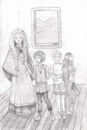 Перед детьми стояли три угрюмых викинга, одетые в боевые доспехи, сжимаюшие в ручищах топоры, и с очевидным любопытством смотрели на мальчишку и девчонку.