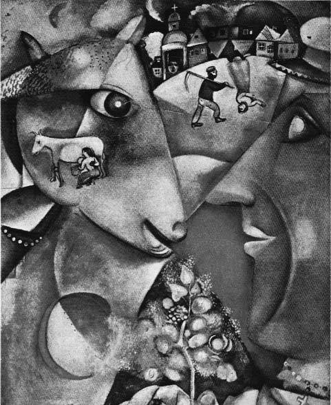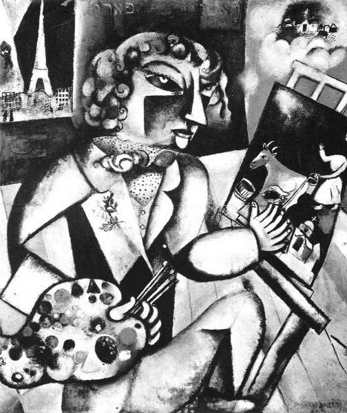 Уже по возвращении в Витебск, на белом незакрашенном фоне картины 1915 года Еврей в красном, изображающей еврея – вечного странника с мешком в руке, с которым олицетворяет себя художник, Шагал записал имена живописцев, играющих существенную роль в его творческой судьбе: среди них Чимабуэ, Эль Греко, Шарден, Фуке, Тинторетто, Рембрандт (его имя записано на идише), Брейгель Мужицкий, а из современных художников только три – Пикассо, Сезанн и Руссо.