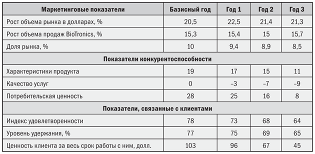 Теперь у нас, кроме благоприятной картины, которую рисовали финансовые показатели, имеется иная оценка 3-летней работы BioTronics. Хотя она получила прибыль, от нее начали уходить клиенты, снизилась доля рынка и значительно сократилась потребительская ценность. Руководство и акционеры BioTronics знали, что с точки зрения финансовых показателей все хорошо. Но, не имея маркетинговых показателей, они даже не представляли себе, сколько уже потеряли и сколько могут потерять в будущем.