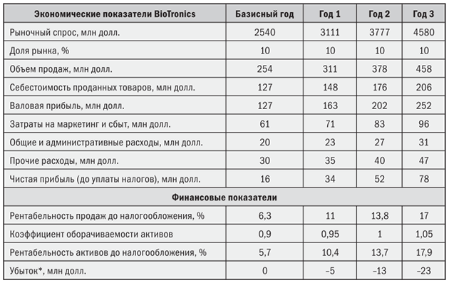 Стратегия удержания рынка, учитывающая его требования, могла бы привести к повышению выручки от продаж до налогообложения (17 %) и обеспечила примерно такую же рентабельность активов, что и прежняя стратегия. Но новая стратегия могла бы принести компании еще 41 млн долл. прибыли (до налогообложения). По сути, компания отказалась от этой дополнительной прибыли. И она будет еще выше за 3-летний период, даже если компании удастся остановить падение доли рынка, а рост на нем прекратится. Если же доля рынка BioTronics будет и дальше уменьшаться, а рынок биотехнологий продолжит рост, «утраченная прибыль» за следующие 3 года может составить 100 млн долл.