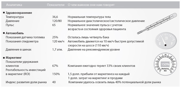 Показатели – важный элемент в любом деле. На рисунке 2.2 перечислены три показателя, связанные с состоянием здоровья, которые обычно проверяются при каждом визите к врачу. Они позволяют специалисту быстро оценить, есть ли у вас отклонения от нормальных значений температуры тела, давления и пульса. Еще более привычны для нас показатели, которые мы используем при управлении автомобилем. Датчик топлива позволяет примерно прикинуть, сколько бензина осталось в баке, спидометр сообщает о скорости, а датчик давления в шинах позволяет оценить, накачаны ли они выше или ниже рекомендуемой нормы.