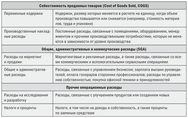 Левая таблица на рис. 2.5 описывает операционную прибыль для Santa Fe Sportswear – компании, производящей и торгующей узкой линейкой специализированной одежды через модные розничные бутики. Операционная прибыль – выручка от продаж за вычетом трех основных типов корпоративных расходов: себестоимости проданных товаров; общих, административных и коммерческих расходов (Selling, General and Administrative expenses, SGA); прочих операционных расходов. Эти три основные категории описаны в табл. 2.5.