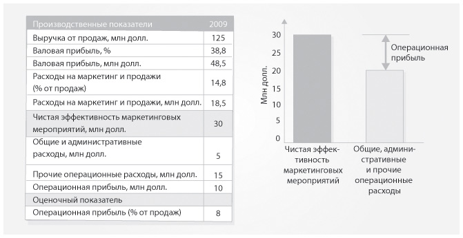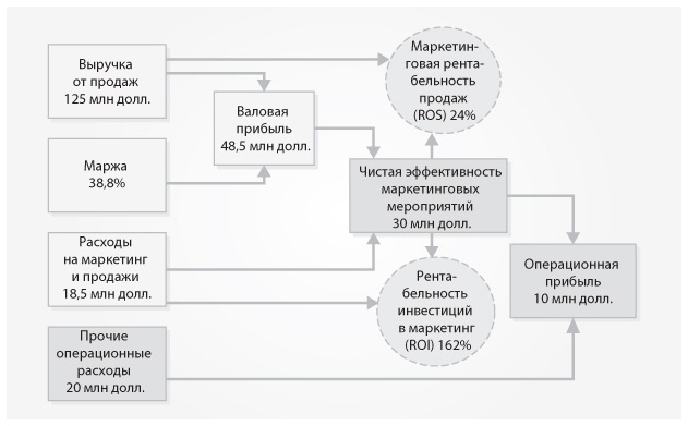 Чистая эффективность маркетинговых мероприятий = Выручка от продаж × Валовая прибыль в процентах – Расходы на маркетинг и продажи = 125 млн долл. × 38,8 % – 18,5 млн долл. = 30 млн долл.