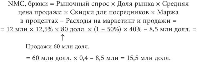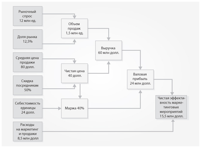 Чистая эффективность маркетинговых мероприятий = Рыночный спрос × Доля рынка × Средняя цена продажи × Скидки для посредников × Маржа в процентах – Расходы на маркетинг и продажи = Выручка × Маржа в процентах – Расходы на маркетинг и продажи.