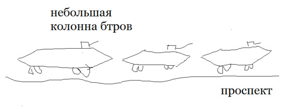 Василий не привык существовать без утреннего кофе. От страха и нереальности происходящего необходимость кофеина лишь усилилась. Пытается зайти в ближайшее кафе – оно закрыто. Капитально так закрыто, с рольставнями. Следующее тоже. В третьем дверь закрыта, но изнутри доносятся крики и звуки ударов. Мимо по проспекту мчится небольшая колонна БТРов. Бронетранспортеры расталкивают и подминают машины, не успевшие увильнуть.