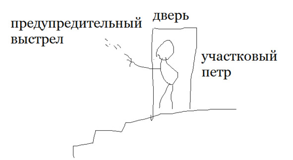 Дверь открывает Петр со второго этажа, лейтенант из местного ОВД. Предположительно открутив при этом магнитный замок. Вася периодически пил с лейтенантом пиво на лавочке перед домом. Петр делает предупредительный выстрел в воздух, впускает всех, кого знает. Возможно, знает не всех – Москва все-таки. Остальным рекомендует не проверять, сколько патронов осталось в обойме. Просит просто поверить, что их еще семь.