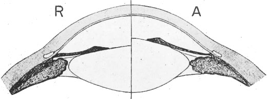 R – предполагаемое состояние покоя хрусталика, при котором он настроен на зрение вдаль. На А, согласно предположениям, поддерживающая мышца расслабляется через сокращение цилиарной мышцы, позволяя хрусталику выпячиваться вперед ввиду его эластичности.