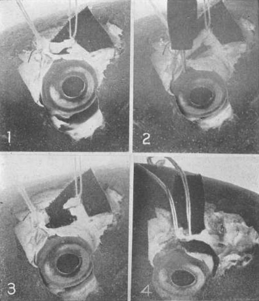 № 1 – Верхняя косая мышца оттянута вверх от глазного яблока при помощи двух нитей, и ретиноскоп показывает отсутствие аномалий рефракции. № 2 – Как определил ретиноскоп, стимуляция электрическим током приводит к возникновению аккомодации. № 3 – Мышца была разрезана. Стимуляцией глазного яблока электрическим током не удалось воспроизвести аккомодацию. № 4 – Разрезанная мышца вновь была соединена путем сшивания. Как и прежде, в результате стимуляции электрическим током возникает аккомодация.